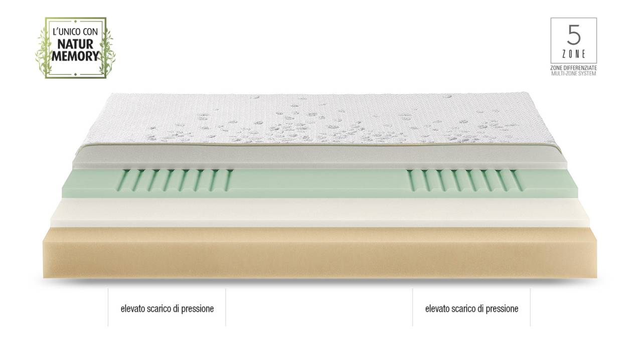 Materasso anatomico a zone di accoglimento differenziato che aiutano il corpo a mantenere una corretta posizione durante il sonno. Il Natur Memory impiegato, allevia la pressione del peso corporeo con conseguente rilassamento dell’intera struttura vertebrale. Reagendo infatti al calore corporeo si automodella in modo naturale, distribuendo il peso uniformemente su tutta la superficie di appoggio. Natur Memory riprende in modo graduale e costante la sua forma di origine dopo l’utilizzo, a garanzia di prestazioni che durano nel tempo.