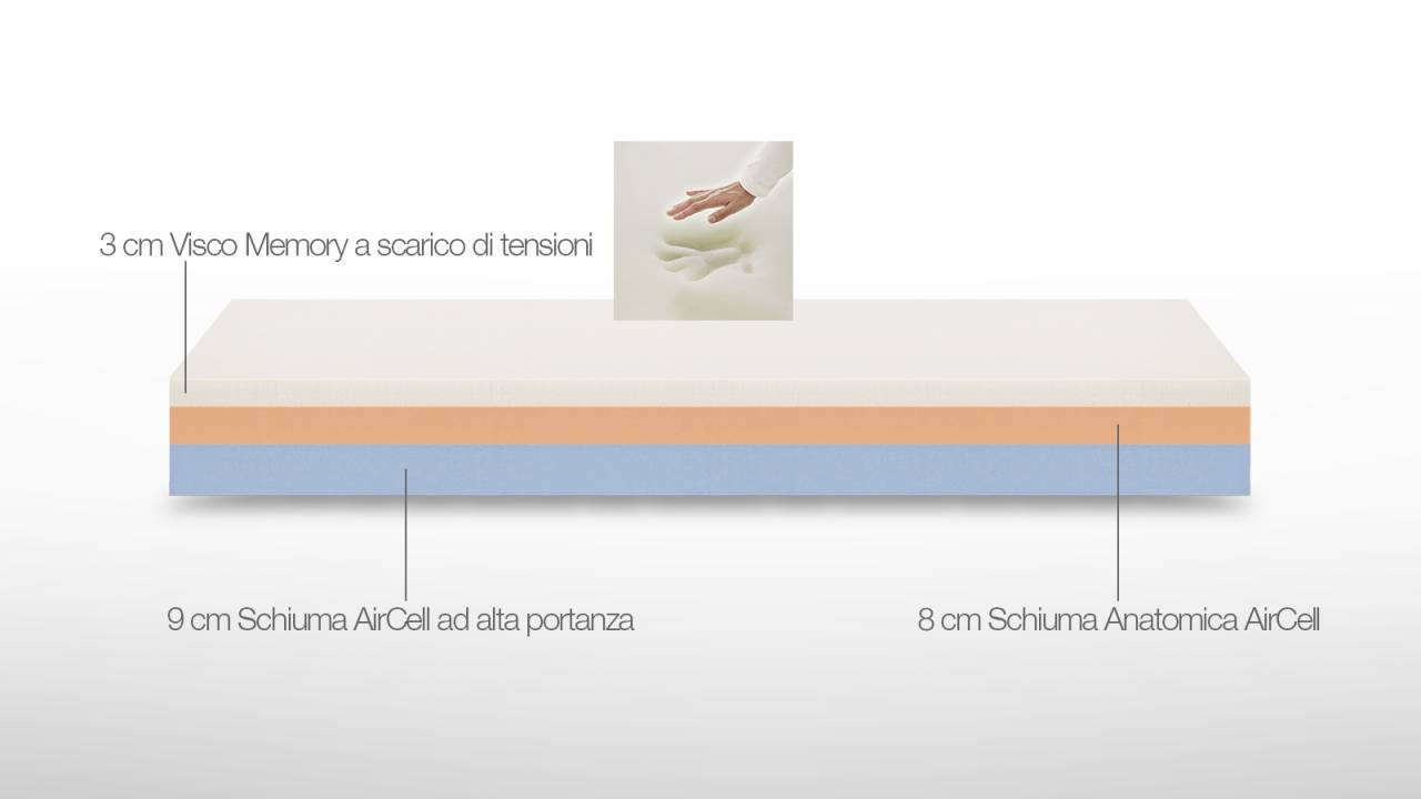 Un materiale evoluto sensibile al calore del corpo umano, che ne influenza la struttura molecolare in grado di adattarsi perfettamente alle forme anatomiche dell'utente. Indeformabile, riacquista in modo graduale e costante la forma originaria, indipendentemente dalla sollecitazione cui viene sottoposta e riduce al minimo i punti di pressione durante il riposo (evitando intorpidimento e sonno agitato), favorendo così anche un buon flusso sanguigno e linfatico.